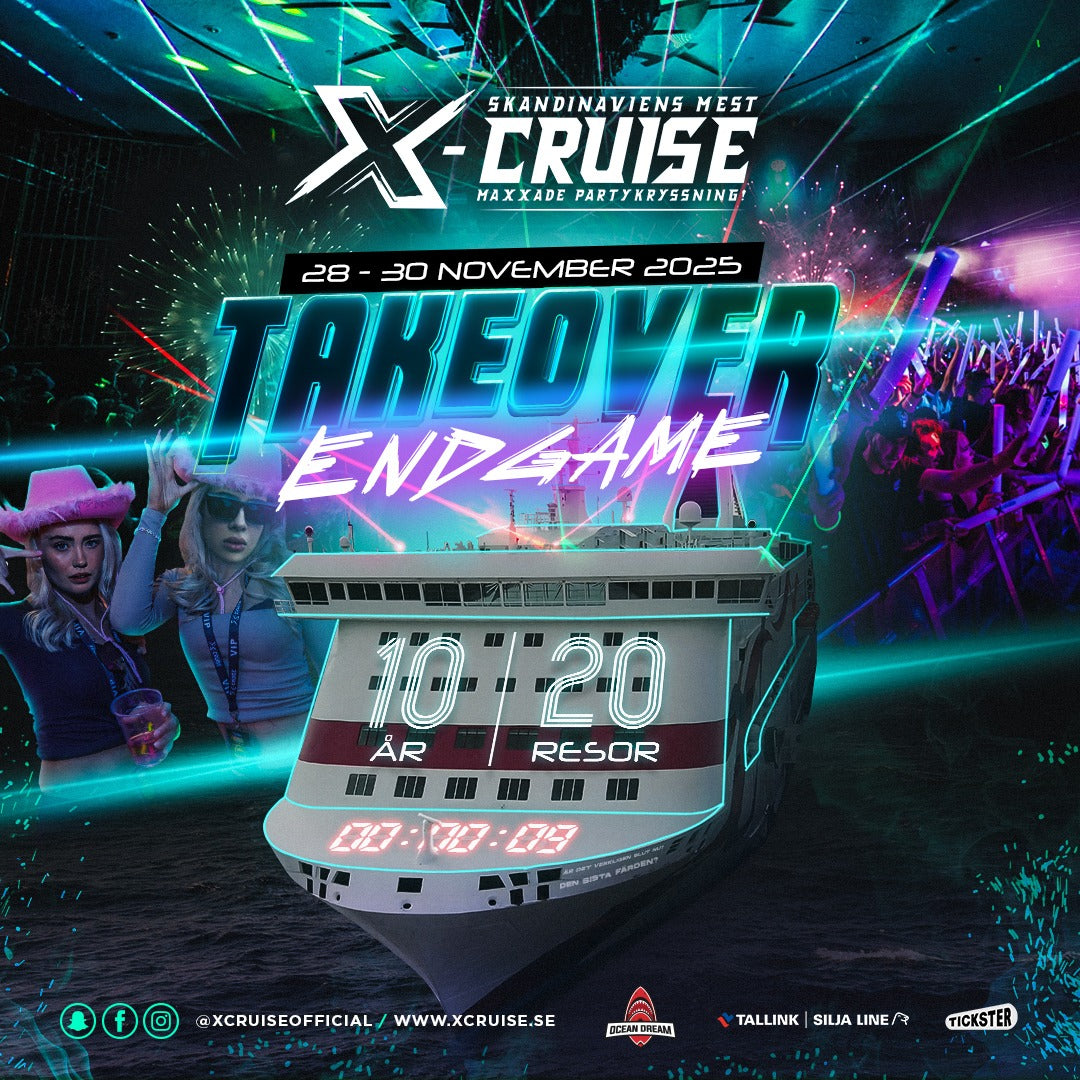 Mellan 28:e–30:e november är det dags för X-CRUISE: TAKEOVER – ENDGAME, årets mest intensiva 40-timmars partykryssning! Som alltid laddar vi upp med ett tungt artistuppbåd, grymma DJ’s och en hel arsenal av överraskningar. Gör dig redo för finalen av säsongen – det här är slutstriden du inte vill missa!